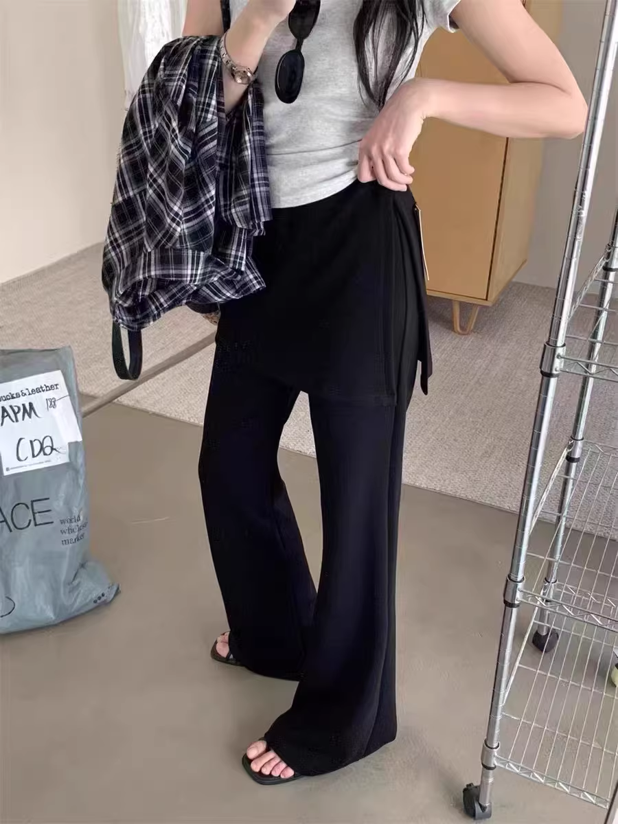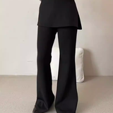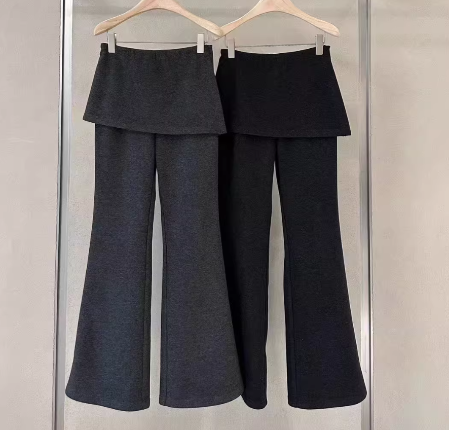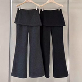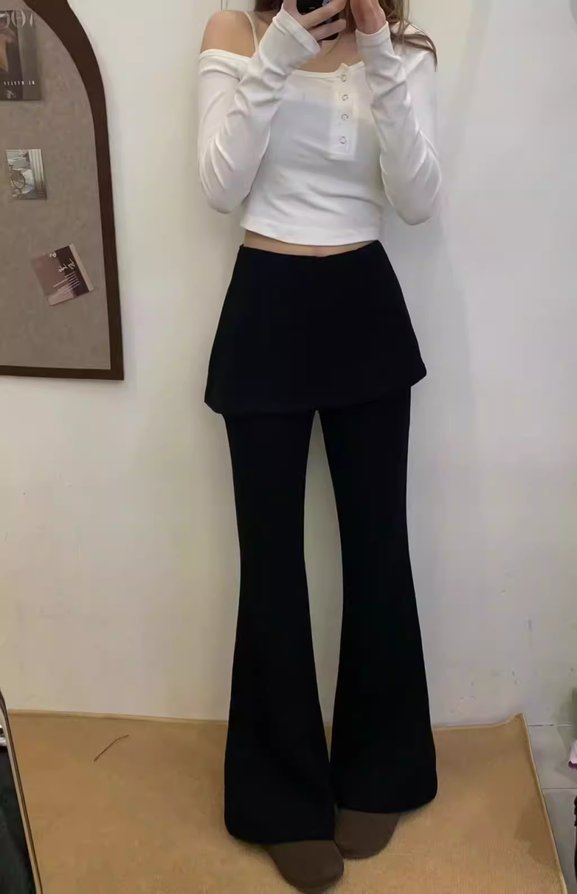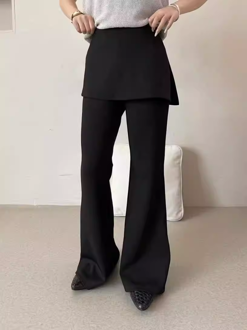 黑色假两件屁帘微喇叭裤女